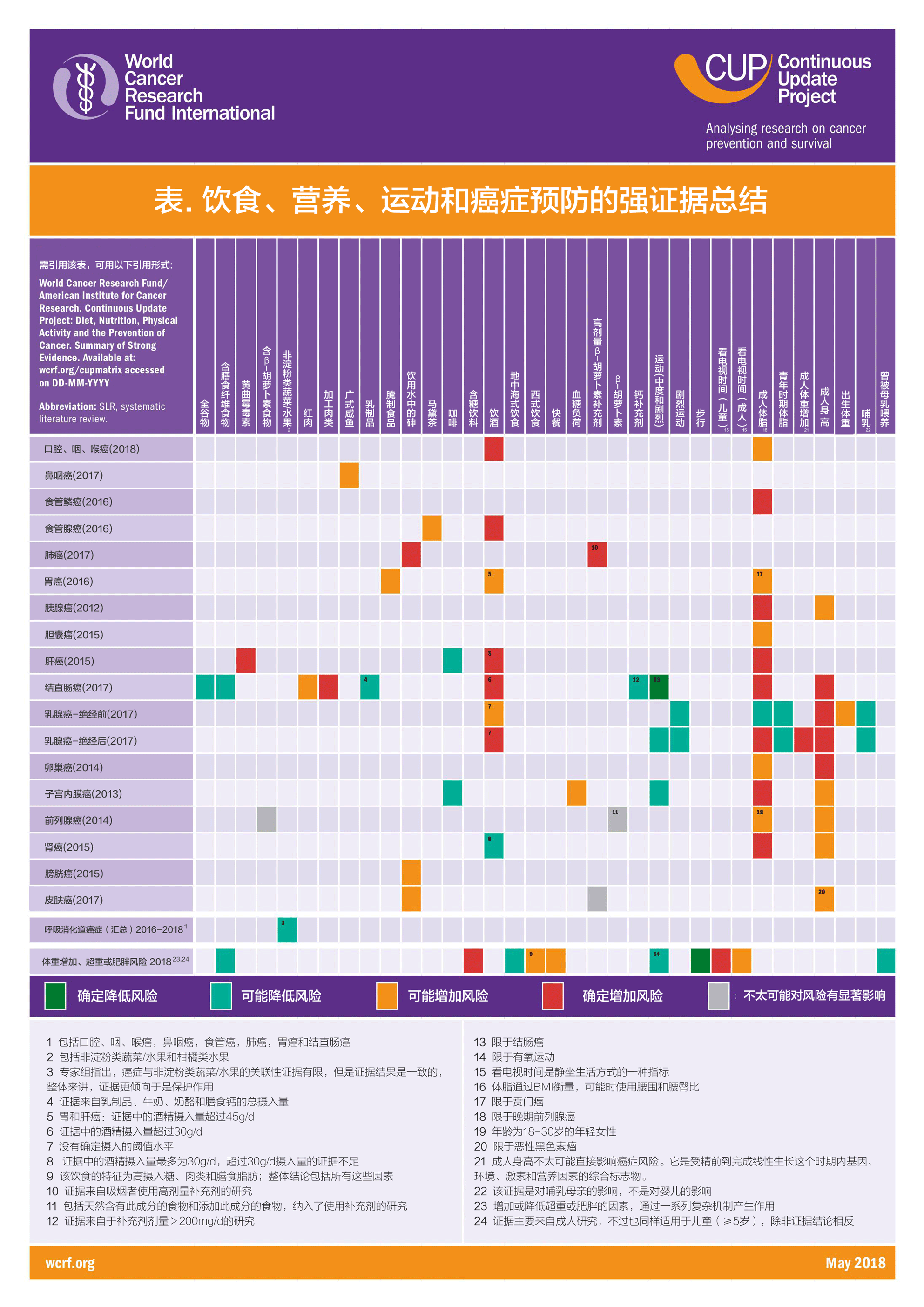 WCRF同时更新了一份“饮食、营养、运动和癌症预防的强证据总结”,详见下表。