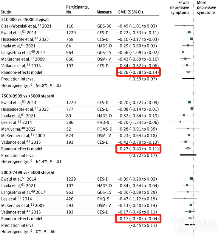 - ≥10000步/天:SMD=-0.26;95%CI,-0.38 to -0.14