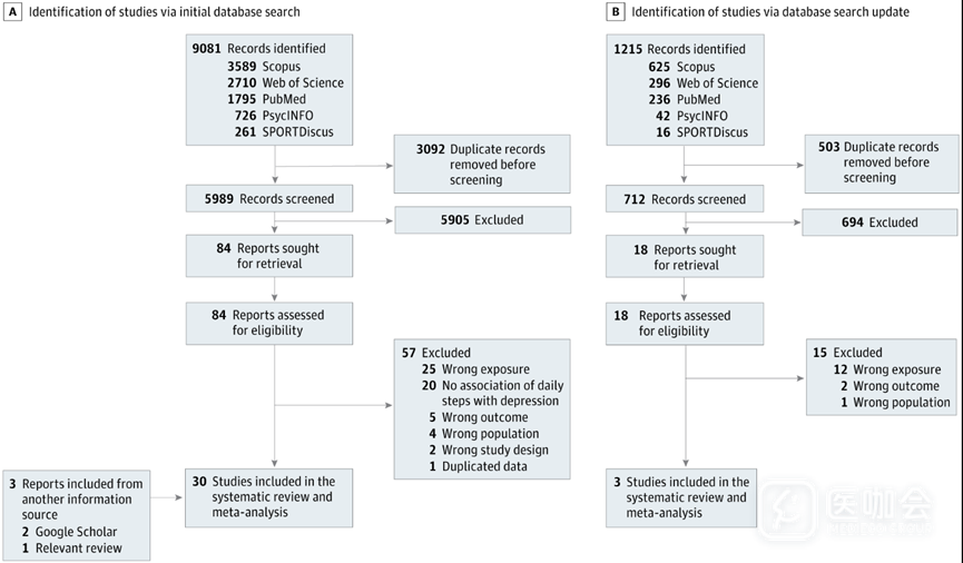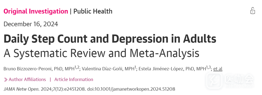 2024年12月16日,《JAMA Network Open》(IF=10.5)发表了一项Meta分析,利用近10万成年人的数据调查了每日步数与抑郁症之间的关联。结果发现,在横断面研究中,与每天步数少于5000步相比,每天≥5000步与抑郁症状减少相关;在前瞻性研究中,每天步数≥7000步与抑郁症风险降低相关。