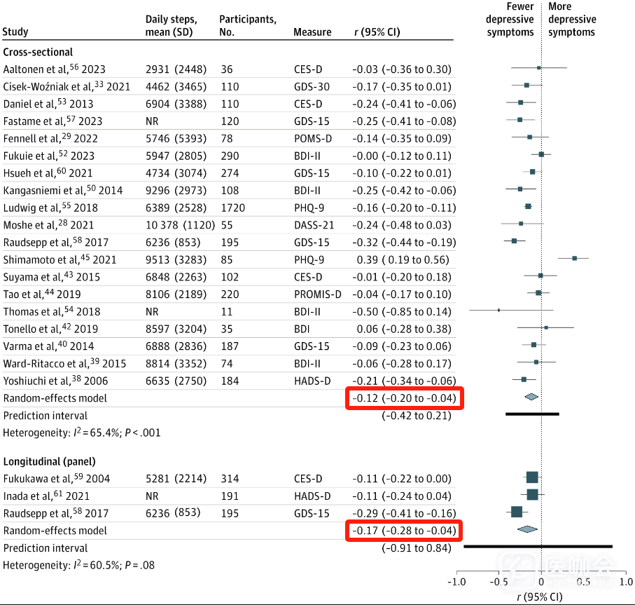 横断面研究(r=-0.12;95%CI,-0.20 to -0.04)和纵向研究(r=-0.17;95%CI,-0.28 to -0.04)均显示,每日步数与抑郁症状呈显著负相关。