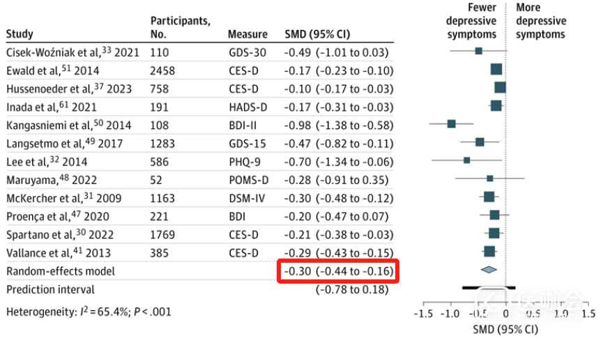 根据每日步数,将参与者的步数划分为高(≥7500)和低(<7500)两个类别。横断面研究显示,相比每日步数低者(<7500步),每日步数高者(≥7500步)与抑郁症状更少相关(标准化均数差[SMD]=-0.30;95%CI,-0.44 to -0.16)。
