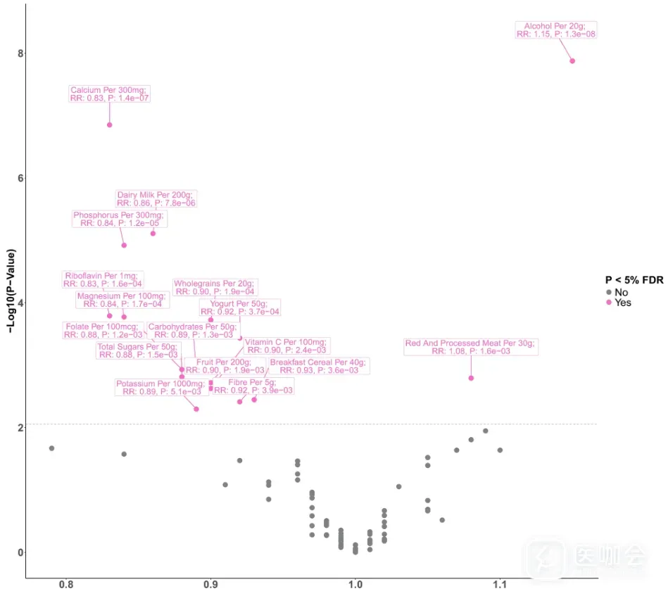 图. 饮食风险因素与结直肠癌风险关联的火山图