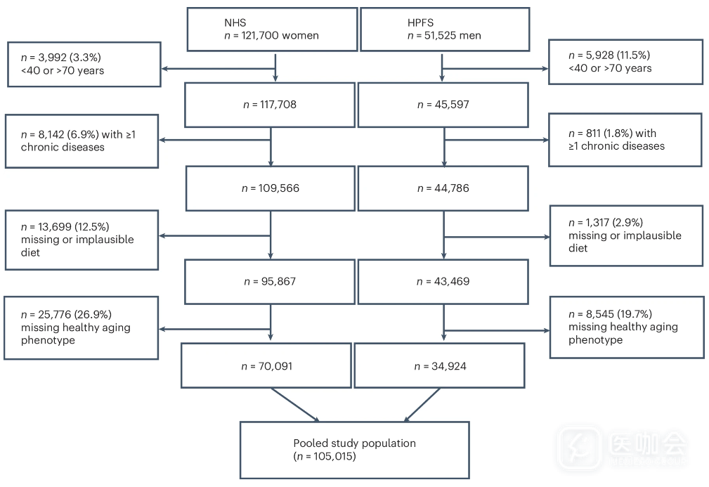 纳入NHS和HPFS中105,015名基线无慢性病的参与者,女性70,091人(来自NHS),男性34,924人(来自HPFS),平均年龄53岁,随访30年(1986-2016年)。
