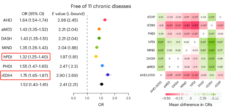 - 无慢性病:rEDIH饮食效果最佳(OR=1.75);hPDI效果最弱(OR=1.32)