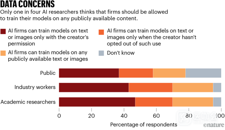 AI模型的个人数据使用问题正引发研究者的高度关注。数以百万计的书籍和科学论文遭盗版并用于AI训练,这加剧了学界对知识产权保护的忧虑。调查显示,仅25%的研究者支持企业使用公开数据训练模型,近半数学者坚持AI公司必须获得数据使用的明确授权,这一比例显著高于公众。