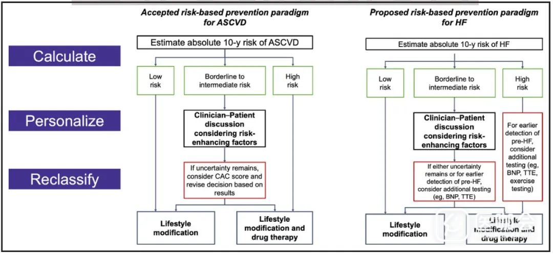 在心衰预防中,借鉴ASCVD预防的C-P-R(计算-个体化-重分类)框架时,需调整第三步,以实现额外检测(如心脏生物标志物和影像学检查)的目标:(1)优化风险预测;(2)早期识别心衰前期(pre-HF)。