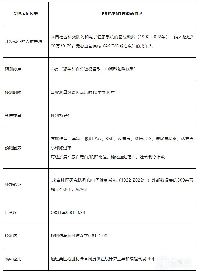 下表总结了PREVENT模型开发过程中影响心衰风险预测的关键考量。该模型的核心优势在于是基于超过320万成年人开发的,涵盖不同种族、地域和社会经济背景,确保了模型的广泛适用性。其次,该模型拓展了年轻成人的风险评估范围,覆盖30-79岁人群,可同时提供10年和30年风险预测,实现短期与长期风险评估。