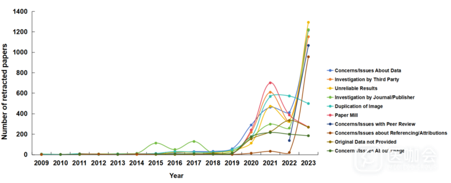 2009-2023年撤稿数量呈现明显的上升趋势。2020年的撤稿数量是2019年的1.29倍,而2023截至10月的撤稿数量更是2009年的31.94倍。这一趋势表明,中国生物医学领域的撤稿问题日益严峻。