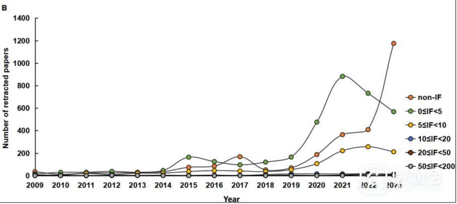 WoS收录期刊占比65.07%(4886篇),其中SCIE期刊占94.58%。此外,研究还显示,在WoS期刊中,撤稿论文最多出现在IF<5的范围内,且随时间推移增加,2021年达峰值。无影响因子(即非WoS期刊)的期刊撤稿数量则也随时间稳步增加。这提示无影响因子/影响因子较低的期刊应受到更多关注。