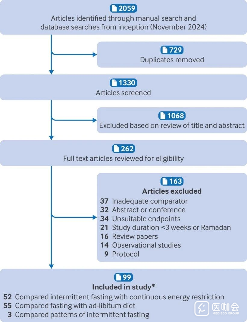 纳入标准为随机临床试验(RCTs),研究对象为所有健康状况的成年人,随访时间至少为3周。排除标准包括:儿童或孕妇的研究、随访时间少于3周的研究、无合适对照组的研究、联合干预且无法分离间歇性禁食策略主要关联的研究、未报告有效终点数据的研究以及宗教禁食的研究。