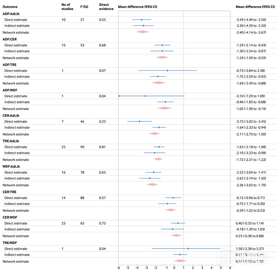 下图显示了所有报告了体重结局的试验的网络分析(93项研究;6247名受试者)。饮食比较数量最多的是限时进食和自由饮食(n=25),其次是持续能量限制饮食和全天禁食(n=23),以及全天禁食和自由饮食(n=16)。