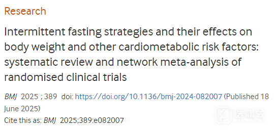 2025年6月18日,《BMJ》(IF=42.7)发表了一项系统评价与网络Meta分析,全面评估了间歇性禁食、持续能量限制饮食、以及自由饮食对体重和心脏代谢风险因素的影响。这项研究涵盖了99项随机临床试验,涉及6582名不同健康状况的成年人,为间歇性禁食策略的有效性提供了全面的科学依据。