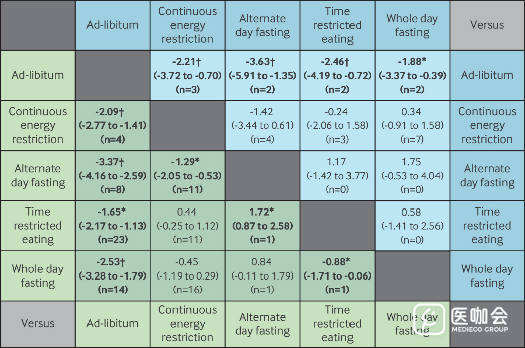 - 与持续能量限制饮食相比:仅隔日禁食显示出额外益处(-1.29 kg;-1.99 to -0.59,中等确定性证据),而限时进食和全天禁食与持续能量限制无显著差异。