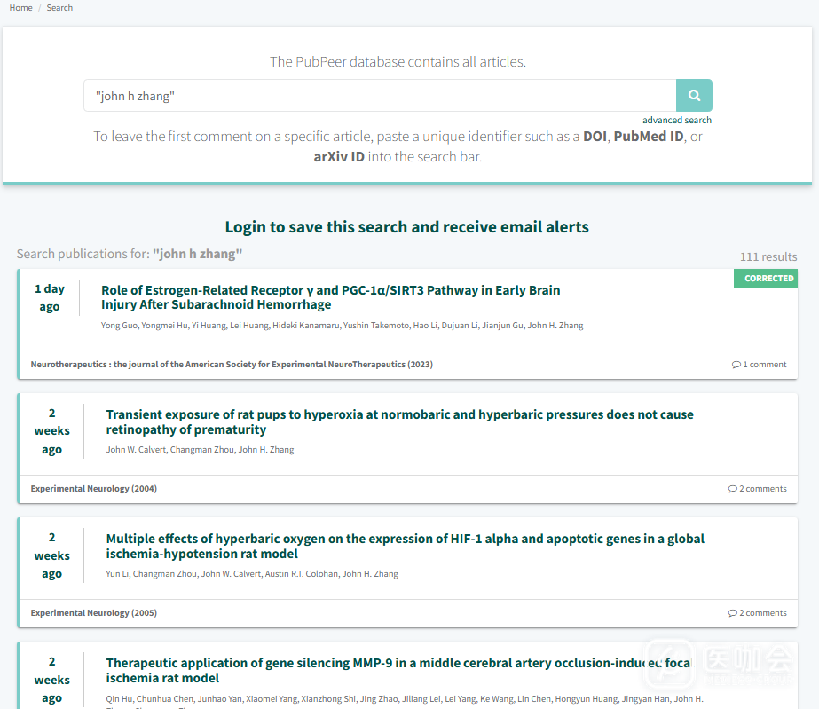 在PubPeer上搜索“John H. Zhang”(https://pubpeer.com/search?q=%22john+h+zhang%22),目前已更新至111条