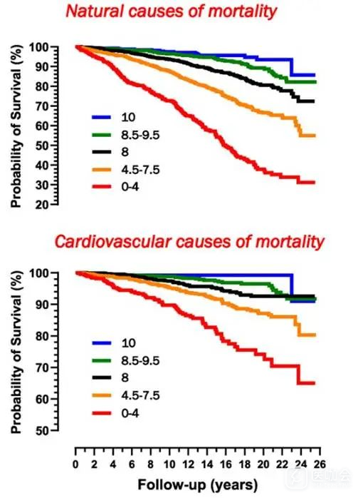 Cox回归模型分析显示,调整变量后,与满分组相比,0-4分组自然死亡和心血管死亡风险比(HR)分别为3.84(95% CI 2.25-6.97)和6.05(95% CI 2.29-20.94)(P<0.001)。