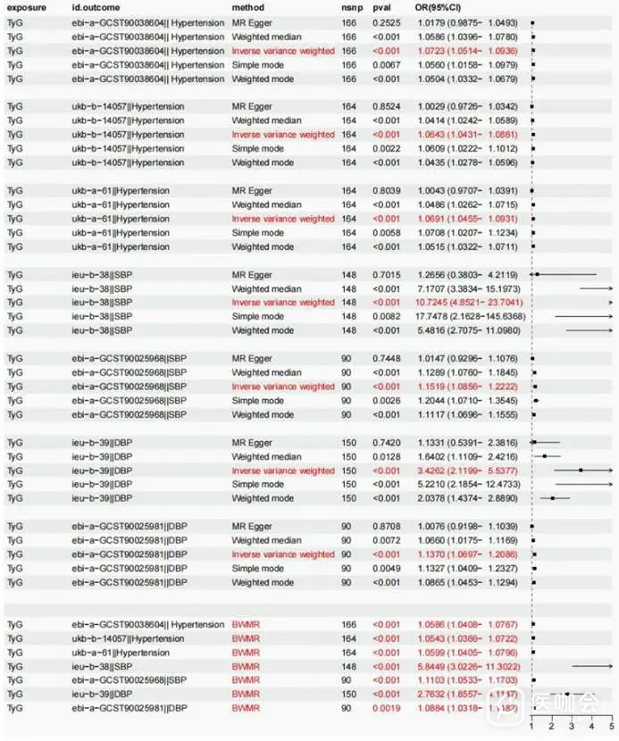 IVW和BWMR证实遗传性 TyG 指数水平升高与新发高血压风险增加之间存在显著的因果关系(P<0.05)。