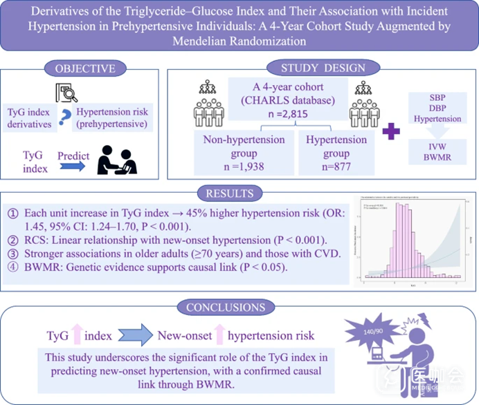 研究基于CHARLS数据库,开展了为期4年的队列研究,并结合MR分析,发现高血压易感人群中TyG指数及其相关指标与新发高血压风险呈正相关,与既往部分研究显示一致结果。先前的研究大多采用观察性设计,本研究使用了孟德尔随机化分析,减少了反向因果和未测量的混杂因素的影响,强调了这些指标对高血压风险的预测性能。