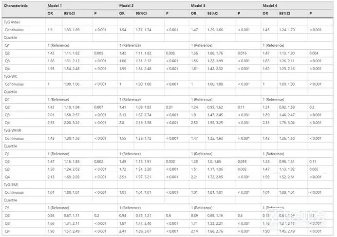 - TyG-WHtR=TyG×WHtR,Q1(0.493-4.102)、Q2(4.102-4.621)、Q3(4.622-5.191)、Q4(>5.191);