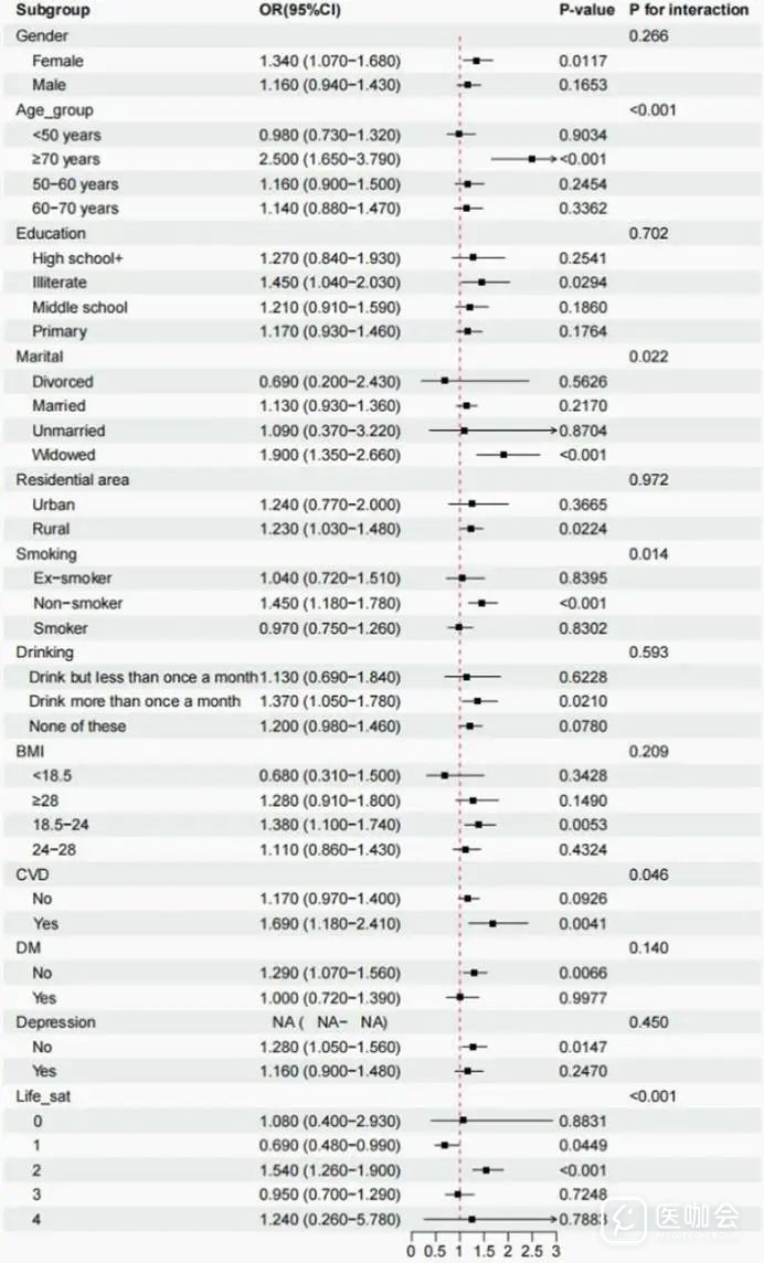 为了探索潜在的效应修饰,根据年龄、性别、婚姻状况、教育水平、居住地区、饮酒、吸烟、BMI、糖尿病、CVD、抑郁和生活满意度进行了亚组分析。