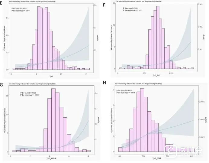 RCS 分析模型4表明,TyG 指数和TyG-WC与新发高血压之间存在显著的线性相关(总体P<0.001,非线性P为0.844和0.165),而TyG-WHtR和TyG-BMI表现出显著的非线性正相关(总体P<0.001,非线性P为0.001和0.046)。