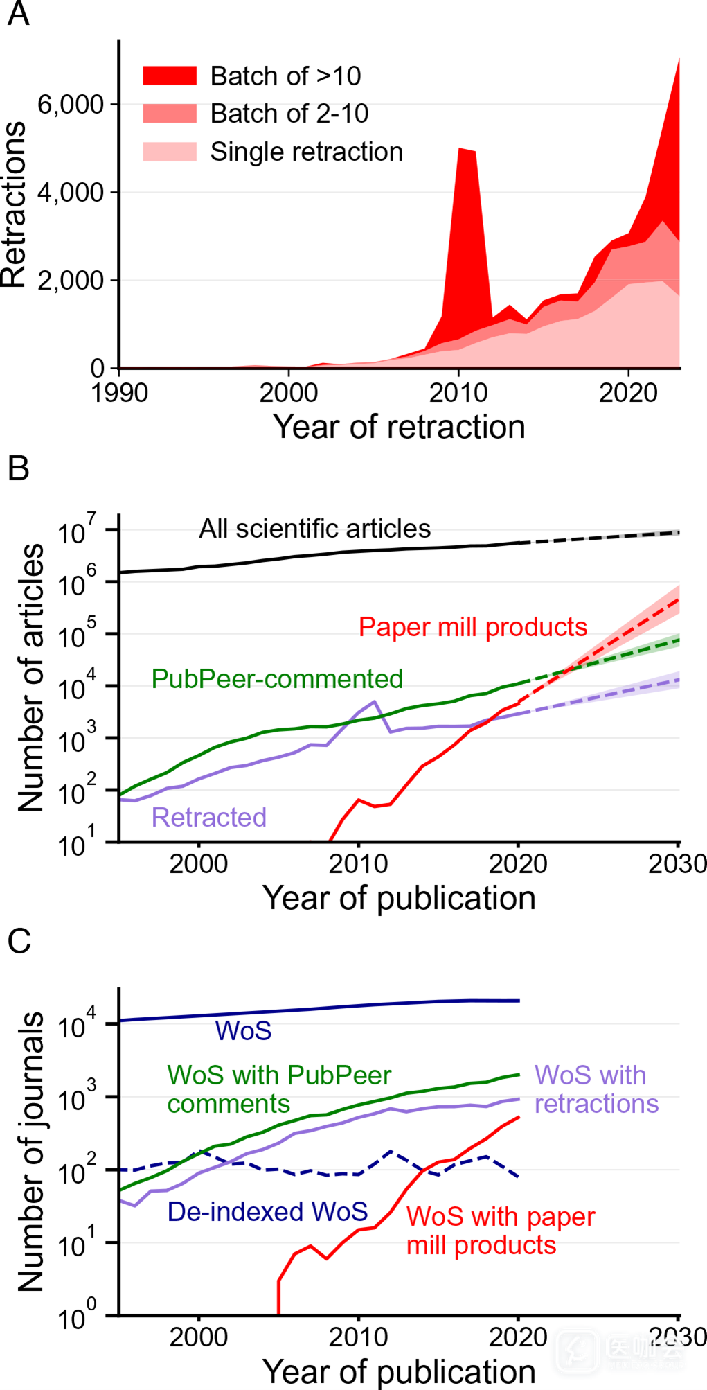 我们还发现,在过去的30年里,撤回论文的数量呈指数级增长。值得注意的是,我们发现在PubPeer被评论的论文数量也呈指数级增长,这证明了出版后同行评议工作的巨大影响。我们注意到,撤回的论文和在PubPeer被评论的论文的数量分别每3.3年和每3.6年翻一番,而出版物的总数每15.0年翻一番。然而,可疑的论文工厂产品每1.5年翻一番。值得注意的是,可疑的论文工厂产品现在超过每年撤回的论文,预计很快就会超过在PubPeer被评论论文的数量。