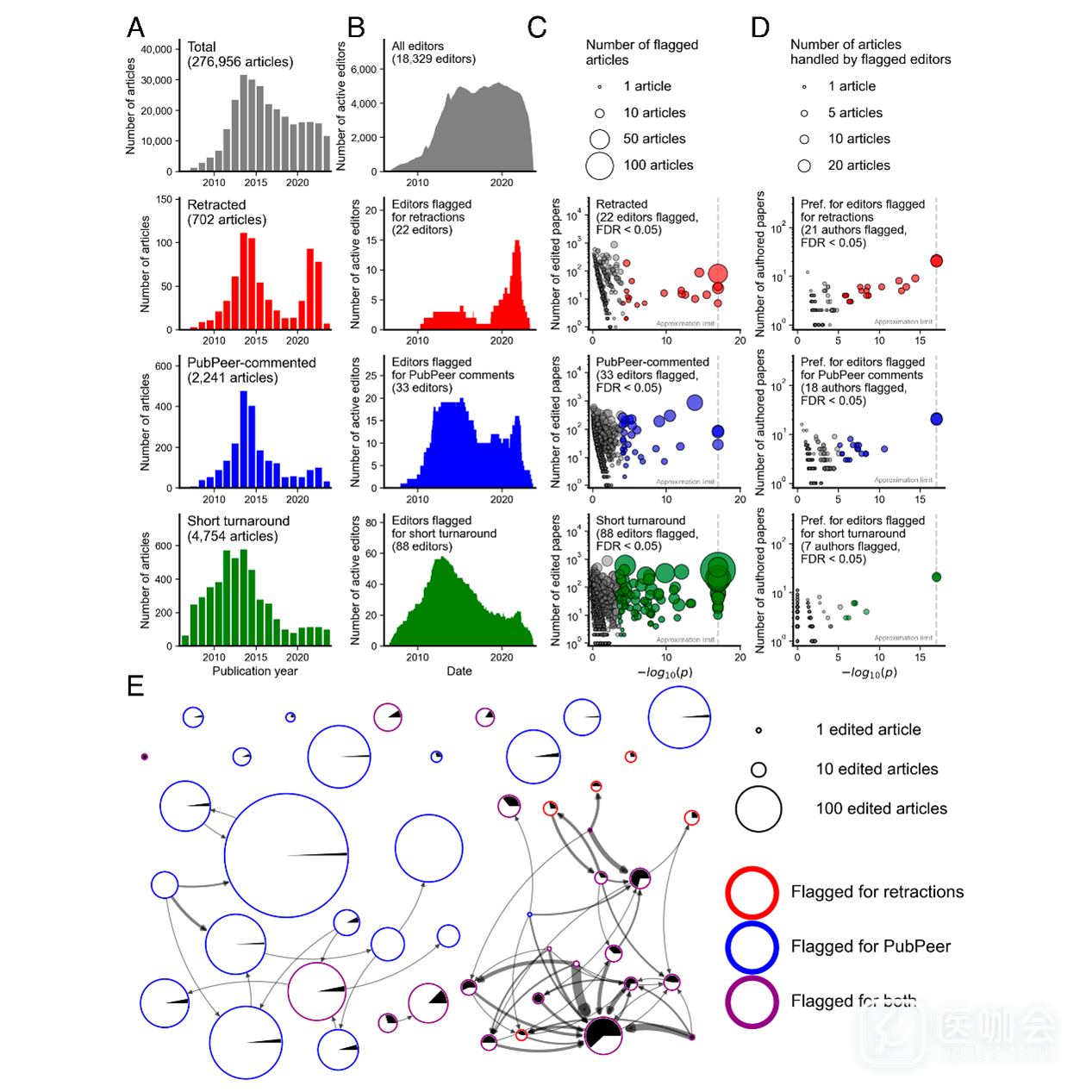 图1:PLOS ONE中编辑与作者协同发表可疑论文的证据。(C)发现编辑接受了异常数量的论文,这些论文后来被撤回(第二行),后来在PubPeer中被评论(第三行)。圆圈表示一位编辑,圆圈的面积与他们接受的论文数量成正比。(E)被标记为撤回的个人之间的出版互动和/或PubPeer评论。圆圈来表示一个人,圆圈的大小与他们作为编辑处理的接受论文的数量成正比(范围1至852篇)。圆圈内的黑色楔形表示该编辑接受的论文中后来被撤回的部分。标记为PubPeer评论的个体具有蓝色边界,标记为两者的个体具有紫色边界。个体由从作者指向编辑的箭头连接,每个箭头的宽度与该编辑为该作者服务的论文的总数成比例被标记的个人经常处理彼此向PLOS ONE提交的论文,特别是在2020年至2023年的编辑组中(右下角的集群)。