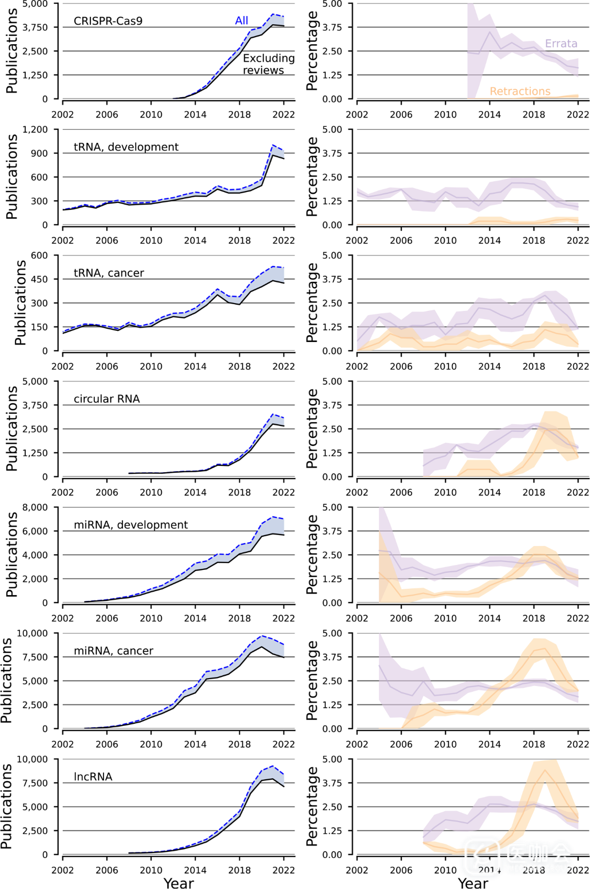 图3 与生物医学研究密切相关的学科的勘误率与其他领域相似,但撤回率不同。关于lncRNA和miRNA与癌症的研究的撤回率的峰值约为4%,这种错误率不太可能解释为善意的错误,而是指向学术造假。