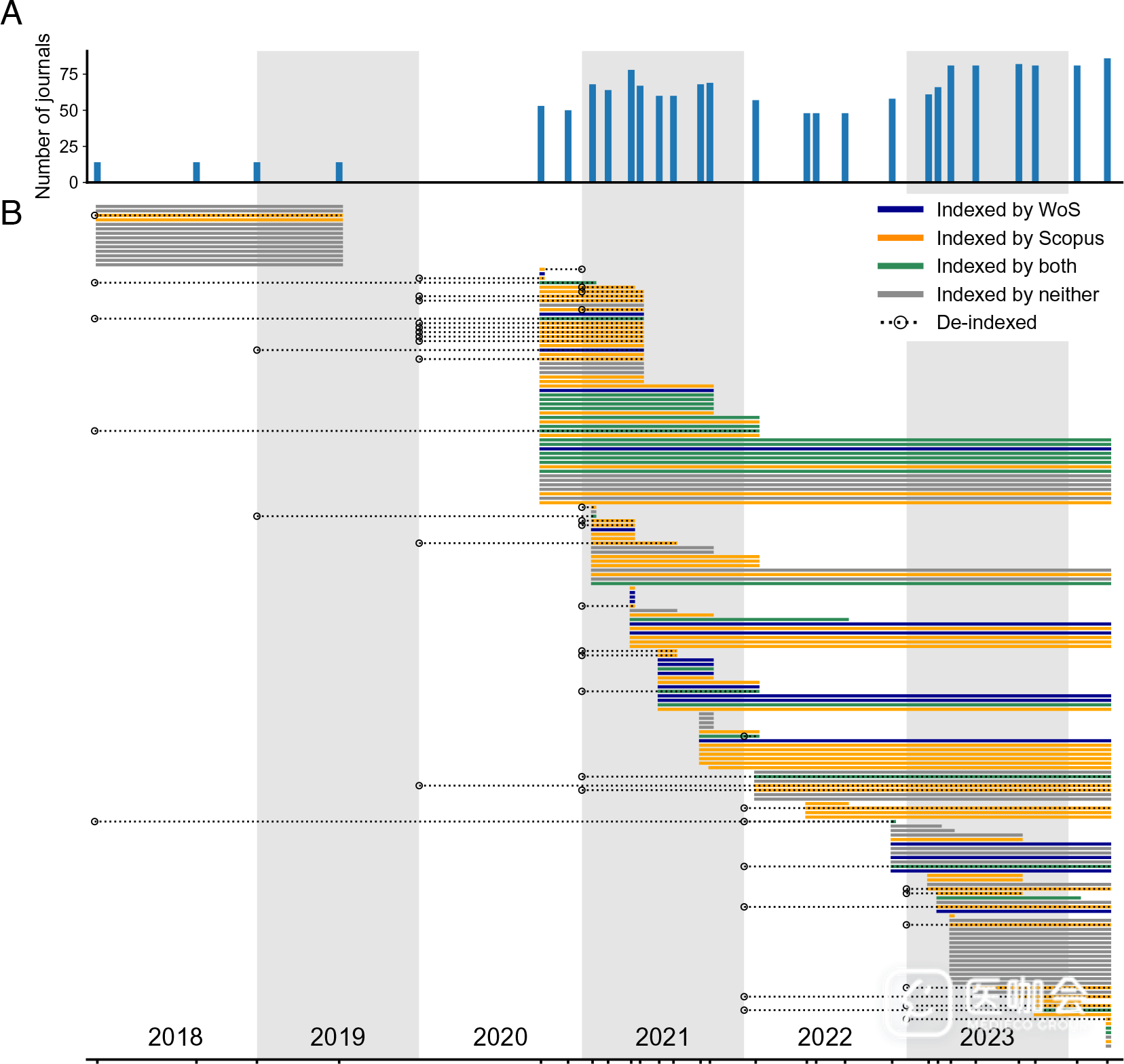 被ARDA列出的期刊被剔除的概率远高于所有期刊的基线水平。具体而言,2020年被ARDA列出的39本Scopus索引期刊中,有13本(33.3%)随后被剔除;而当年所有活跃[未停刊的]Scopus期刊的剔除率仅为0.5%。ARDA对期刊组合的调整常常与期刊被剔除密切相关。例如,一批在2020或2021年被Scopus剔除的期刊,于2021年5月被从ARDA网站上下架,并被新期刊取代。据我们所知,这是首次有证据显示一个涉及欺诈性出版的实体本身存在“期刊跳跃”行为。部分被这些组织“瞄准”的期刊,其年度发表量迅速上升,这一现象进一步支持“期刊跳跃是一种普遍行为”的假设。