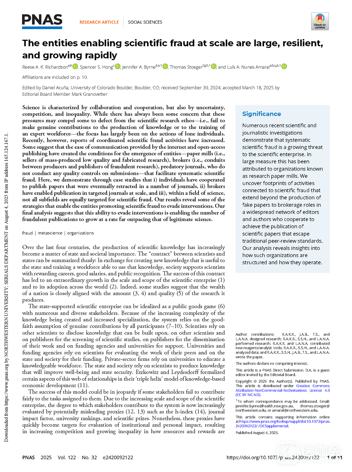 2025年8月4日,美国西北大学的里斯·理查森(Reese Richardson)等人在顶级期刊《美国国家科学院院刊》(PNAS)发表题为The entities enabling scientific fraud at scale are large, resilient, and growing rapidly(推动大规模学术造假的实体组织规模庞大、韧性强且正迅速扩张)的研究论文。作者理查森同意将论文内容摘译成中文以便中国读者阅读。论文和相关资料摘译如下(删减部分不特别注明,[ ]内为译者注):