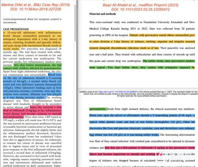 下图并排对比2019年《BMJ Case Reports》论文(左)与2023年medRxiv预印本(右)。已对部分句子颜色标注以便对照。