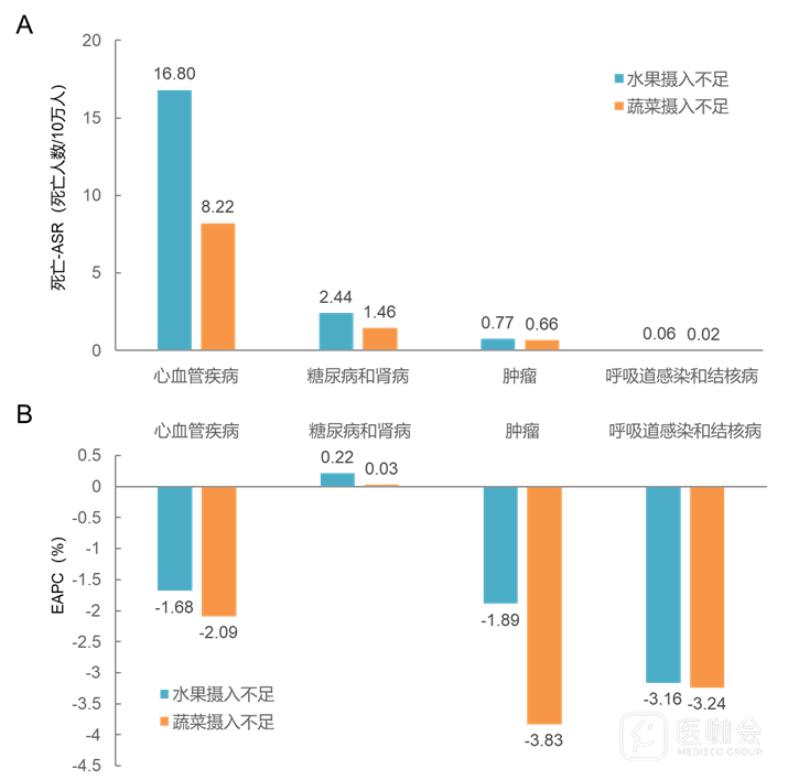 1990年至2021年间,全球因水果和蔬菜摄入不足导致的死亡及DALY绝对数量有所上升,但ASR却呈下降趋势。低SDI国家、男性、老年人疾病负担显著更高,随着时间的推移,低SDI与高SDI地区在摄入水平及相关疾病负担上的差距进一步扩大。心血管疾病是水果和蔬菜摄入不足所导致死亡和DALY损失的首要原因。