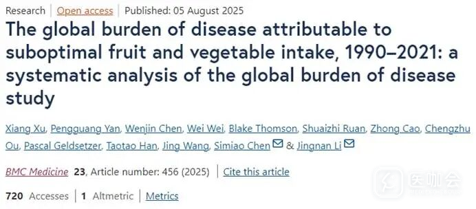 2025年8月5日,《BMC Medicine》发表了一篇文章,研究了1990-2021年间全球多个国家和地区25岁以上成人因果蔬摄入不足导致的疾病负担,研究显示,果蔬摄入量未达最佳摄入水平(水果:340-350g;蔬菜:306-372g),心血管疾病是果蔬摄入不足所导致死亡和DALY损失的首要原因。