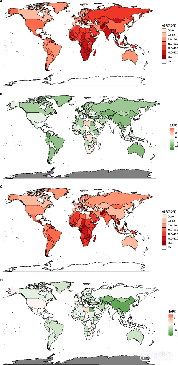 图. 2021年,因水果摄入不足导致的死亡-ASR(A)和EAPC(B),因蔬菜摄入不足导致的死亡-ASR(C)和EAPC(D)