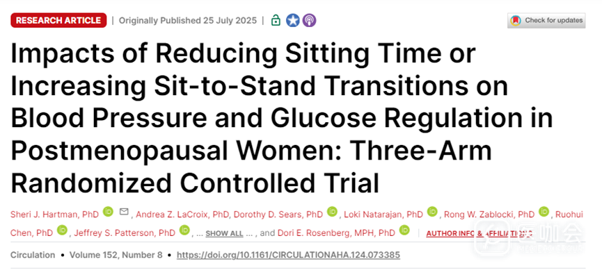 2025年7月25日,《Circulation》(IF=38.6)发表了一篇研究,比较改变久坐的两种方式,对绝经后女性行为和生理指标的影响差异。研究发现:增加坐-站转换次数,可在3个月内改善超重/肥胖绝经后女性的舒张压。