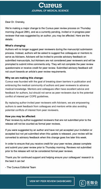 大型期刊《Cureus》不再允许作者推荐审稿人