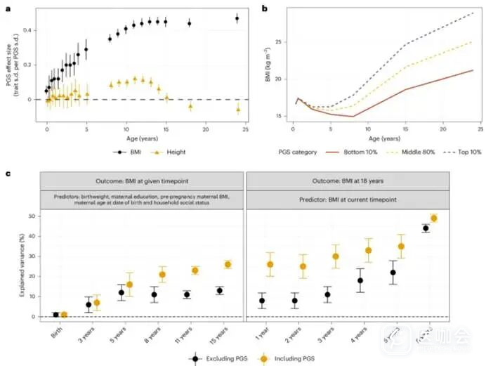 在预测成年早期BMI时,与BMI相比,年龄较小的时候加入PGS更具价值:从5岁时的1.5倍(从22%增至35%)到1岁时的超过三倍(从8%增至26%)(图4c右)。