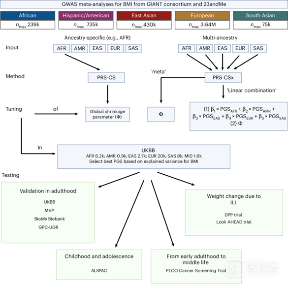 本研究通过最大的BMI GWAS Meta分析(使用了人体性状遗传研究协会[GIANT])和基因检测公司[23andMe]数据)的结果,推导针对BMI和肥胖的特定血统及多血统PGS,以检验其在不同成人、儿童和青少年、强化生活方式干预的减重背景下的表现。