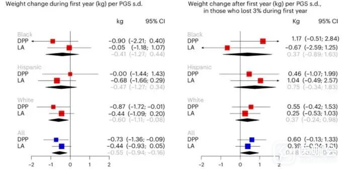 PGS较高的肥胖/超重个体强化生活干预第一年减重较多,但其反弹风险也更高。关于遗传因素如何影响减肥干预效果的研究证据仍相对匮乏且结论不一致。这种不确定性源于研究中的遗传变异类型、研究方法及实验设计的差异,充分表明了减重干预对高效能PGS的需求。