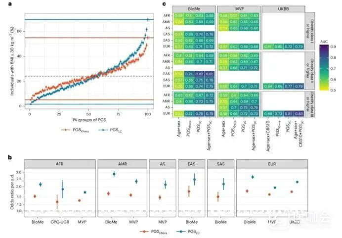 图3.成人肥胖结局预测,a,UKB中EUR子集;b,根据PGS-Khera和PGSLC的标准差,≥I级肥胖的OR;c, Bio Me、MVP和UKB中肥胖结局AUC。