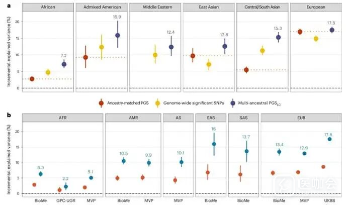 图2.BMI的解释方差,a,UKB人群;b,验证人群,多血统 PGSLC与之前基于较小 BMI GWAS Meta分析发布的PGS-Khera[2]进行比较