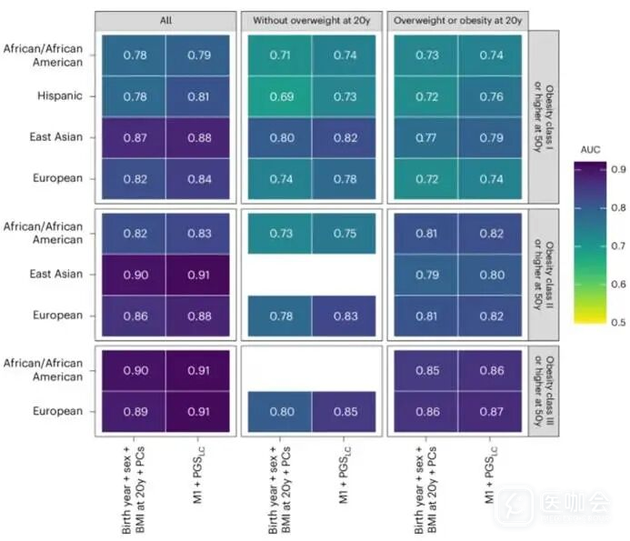 - 从成年早期到中年:在PLCO研究中,研究评估了PGSLC与20岁至50岁间每5年体重和BMI变化之间的关联,按人群和性别分层。研究计算了PGS对50岁时肥胖结局的按人群分层的AUC。