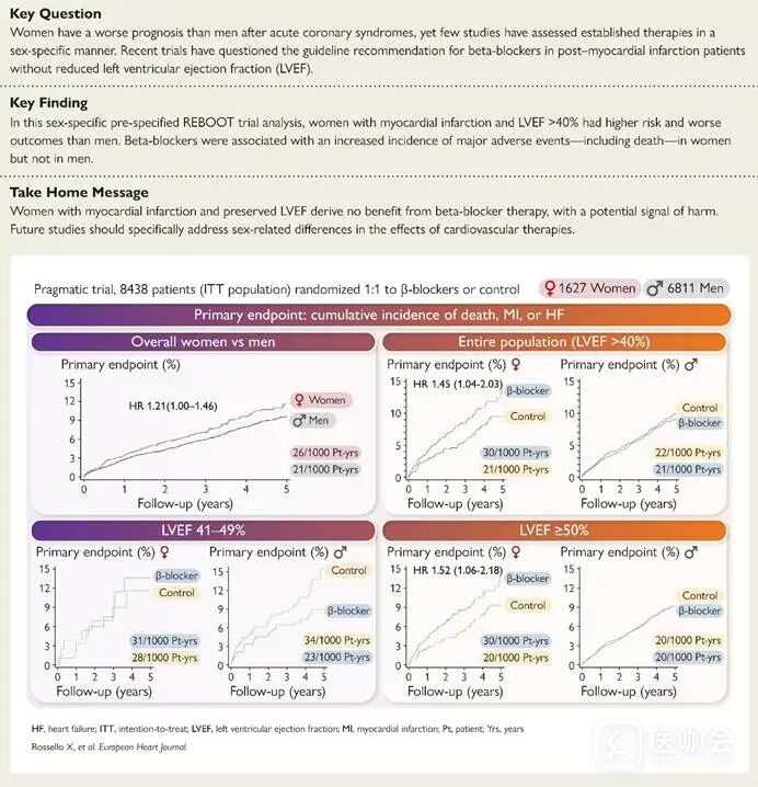 2025年8月30日,《European Heart Journal》(IF=35.6)发表了一篇文章,就REBOOT试验数据对指南推荐提出了质疑,分析显示,女性心梗患者接受β受体阻滞剂治疗或存在潜在危害,尤其是左心室射血分数保留及接受较高剂量的患者,男性患者中没有观察到该效应。