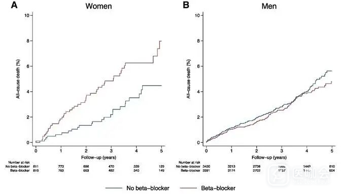 在8438例患者中,其中女性1627例,816例接受β受体阻滞剂治疗。与男性相比,女性患者年龄更大,合并症更多,且接受的指南指导性治疗更少。