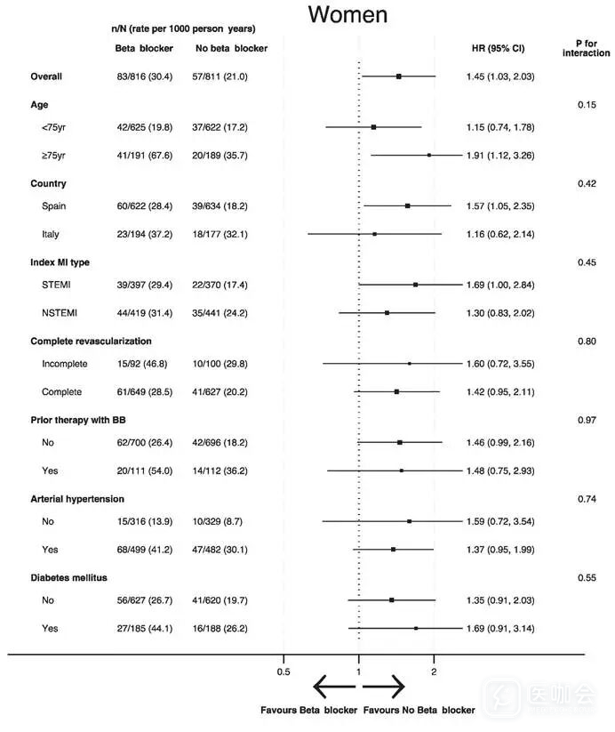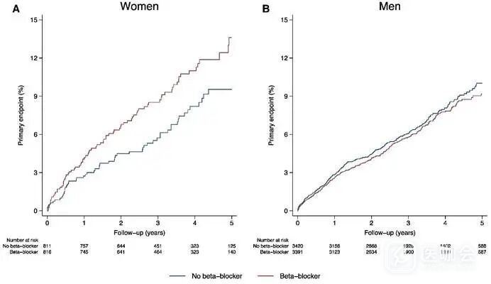 在女性患者主要结局的发生上,接受β受体阻滞剂治疗具有负面效应,该效应在所有关键预设亚组中均保持一致。