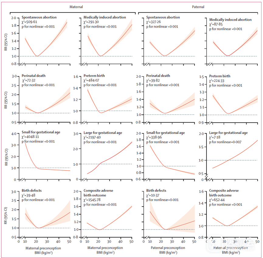 父母BMI与LGA风险(正相关)和SGA风险(负相关)均存在稳健的单调相关性。父母BMI与其他所有不良出生结局均呈J型关联。