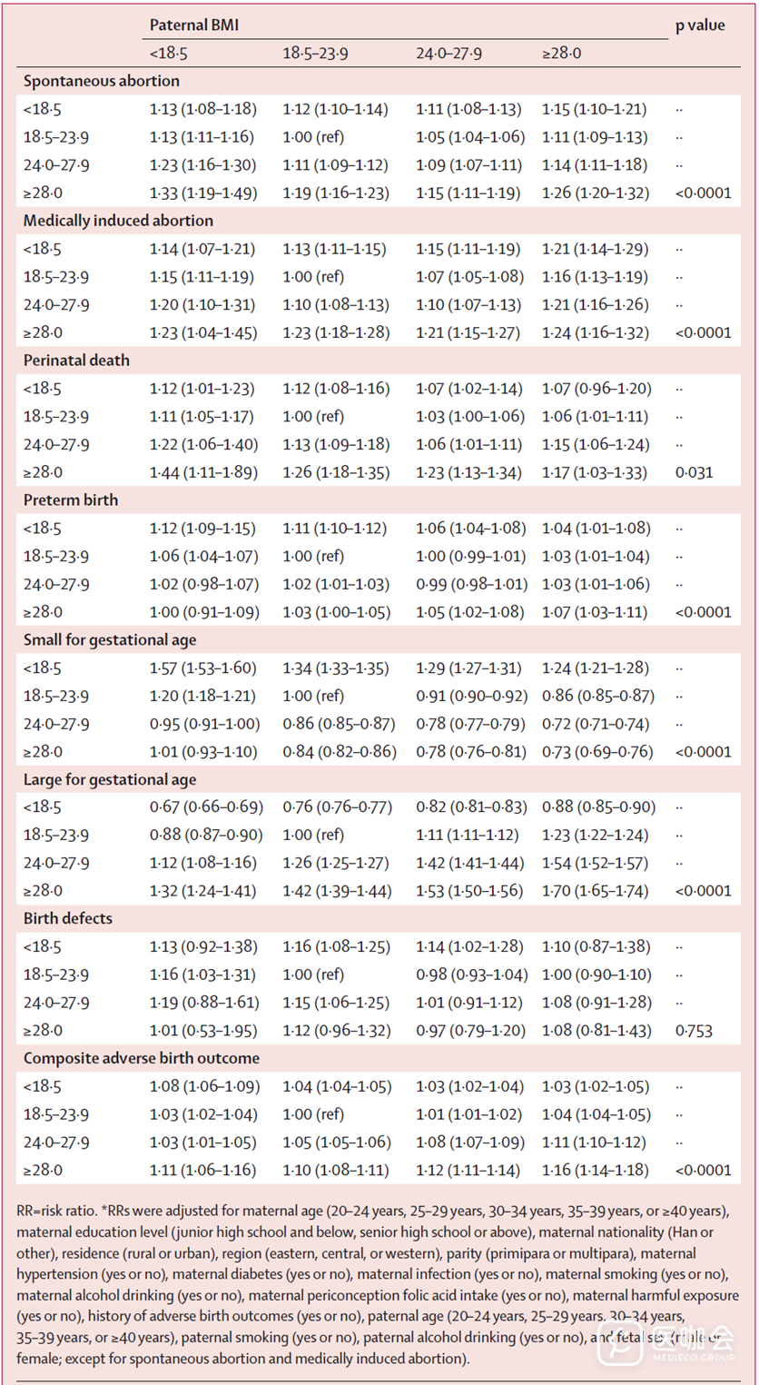 如围产期死亡:相比父母双方均体重正常,母亲体重正常、父亲超重的情况下,新生儿发生该结局的RR为1.03(95% CI 1.00-1.06);父母双方肥胖时RR为1.17(1.03–1.33);双方体重过低时RR为1.12(1.01–1.23)。