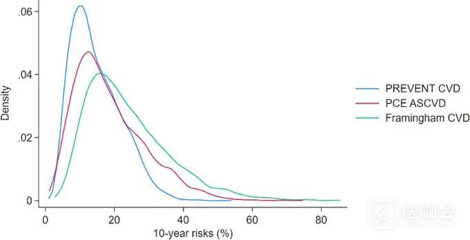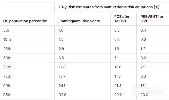 表. 在不同百分位数人群(无CVD、符合启动治疗的条件)中,使用FRS、PCEs及PREVENT模型预测其10年的绝对风险
