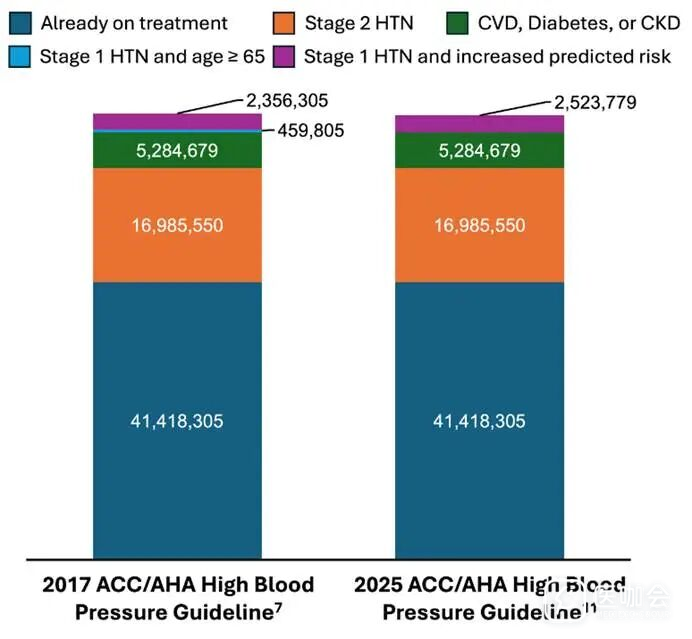 图.两指南正在接受降压药物治疗或建议启动治疗的美国成年人数对比