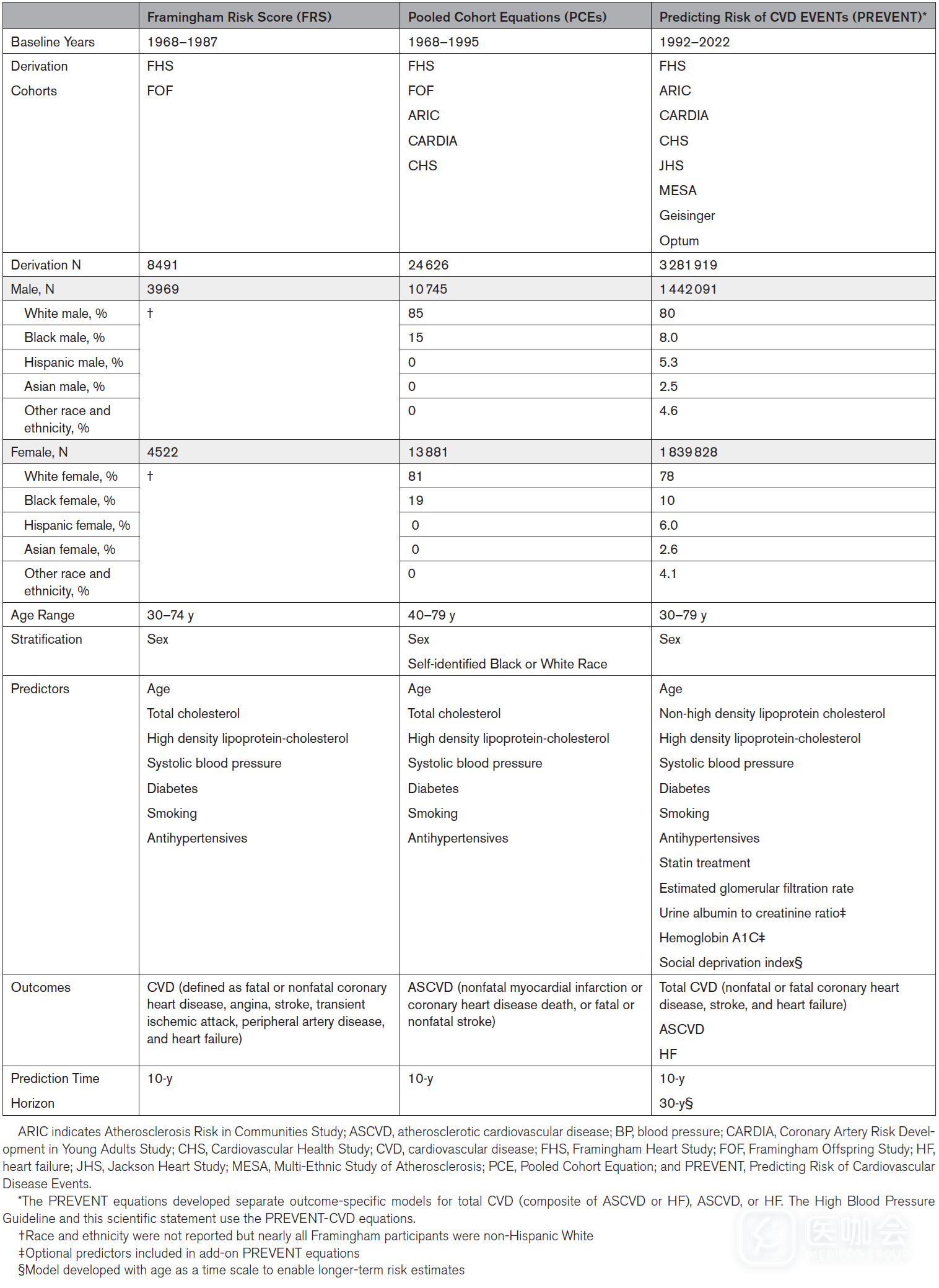 指南编写委员会推荐PREVENT风险预测模型的原因有:(1)模型基于美国大型、当代、具有代表性的人群样本开发;(2)与PCEs相比,PREVENT模型具有更优的区分度与校准度;(3)模型将预测结局扩展至更具临床相关性的总CVD风险,即动脉粥样硬化性心血管疾病与心衰的复合结局。