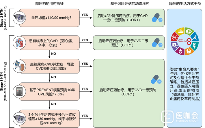 指南建议以下I期高血压患者启动降压治疗:(1)患有CVD(二级预防);(2)糖尿病;(3)慢性肾病(CKD);(4)PREVENT模型预测10年CVD风险≥7.5%。